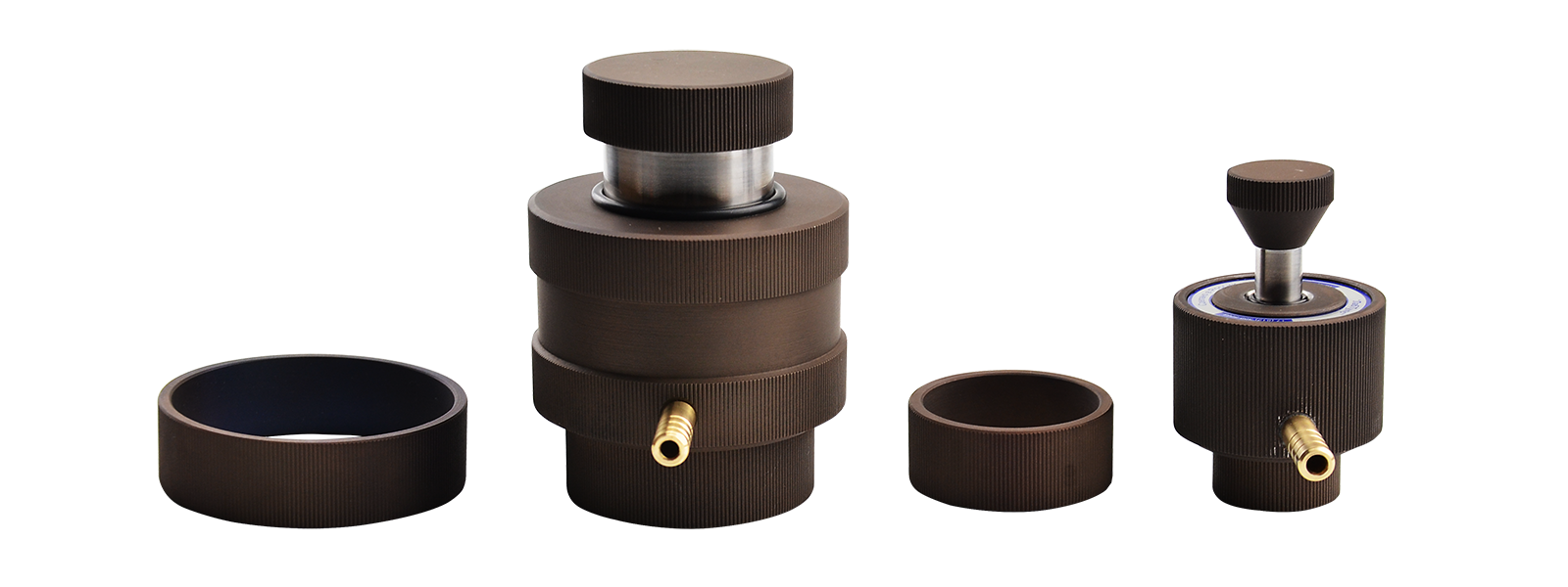 Vacuum die sets are used when it is necessary to remove water vapors from a sample, in particular, during FTIR spectroscopy and production of KBr pellets. Also vacuuming during pressing is used for equal distribution of powder in matrix and air removal from sample during X-ray fluorescence analysis (RSFA or XRF).